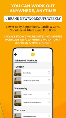 • 5 days per week flexible schedule: Lower Body, Upper Body, Cardio/Core, Shoulders/Glutes, and Full Body Conditioning.